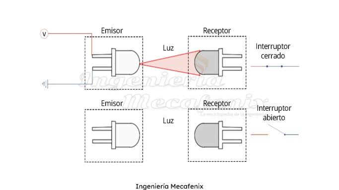 A pesar de ser un dispositivo un poco complejo su funcionamiento es fácil de entender, ya que es parte de los sensores ópticos y solo cuenta con un emisor de luz y un receptor. El emisor es un led infrarrojo que manda un haz de luz hacia el receptor que normalmente es un fototransistor, cuando este dispositivo capta la señal actúa como un interruptor cerrado y cuando se interrumpe actúa como un interruptor abierto.