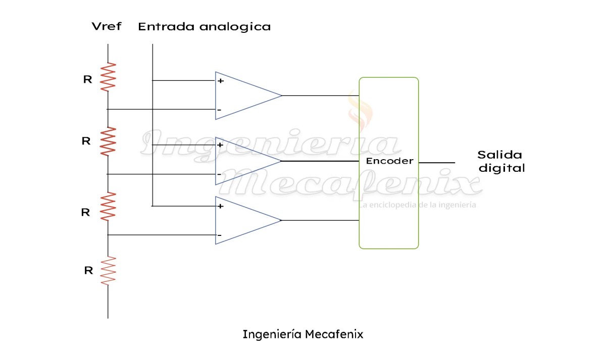 Este tipo de convertidor se caracteriza por ser uno de los más sencillos y más rápidos que existen, ya que solo están conformados por comparadores y resistencias.