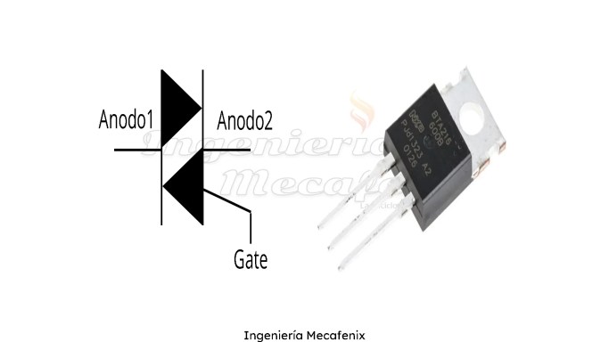 Se usa para la corriente alterna ya que contiene dos tiristores juntos en un mismo encapsulados, en este ocasión solo cuentan con una terminal puerta y esta es capaz de activar a los dos componentes al mismo tiempo. «Articulo sobre el triac»