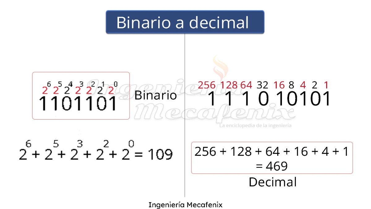 Para poder convertir de binario a decimal siempre tenemos que empezar por el bit menos significativo o el numero de menor valor. Una vez que se localiza este bit debemos empezar a hacer una numeración progresiva sobre los números binarios empezando por 2^0, luego 2^1, 2^2, 2^3 y así sucesivamente hasta tener todos los números binarios con esta nueva numeración. Como paso final para convertir a decimal tenemos que sumar todos los dígitos con el 1 pero con la nueva numeración.