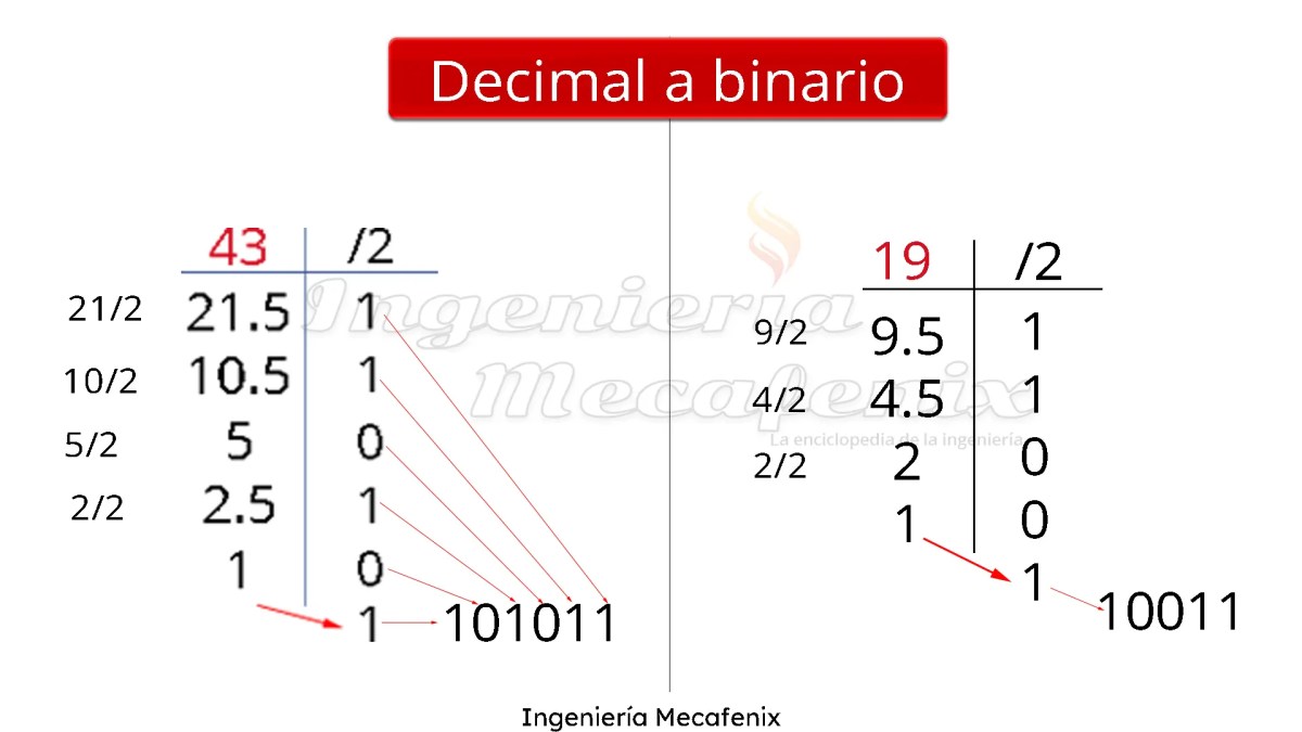 Para convertir de decimal a binario es bastante sencillo ya que tomamos el número y lo dividimos entre dos, si el resultado da un numero entero se pone un 0 y si el resultado da un numero con decimales se pone un 1, al siguiente numero se le quitan los decimales y se vuelve a dividir, al final siempre se arrastra el 1 que sobra y se coloca del lado izquierdo.