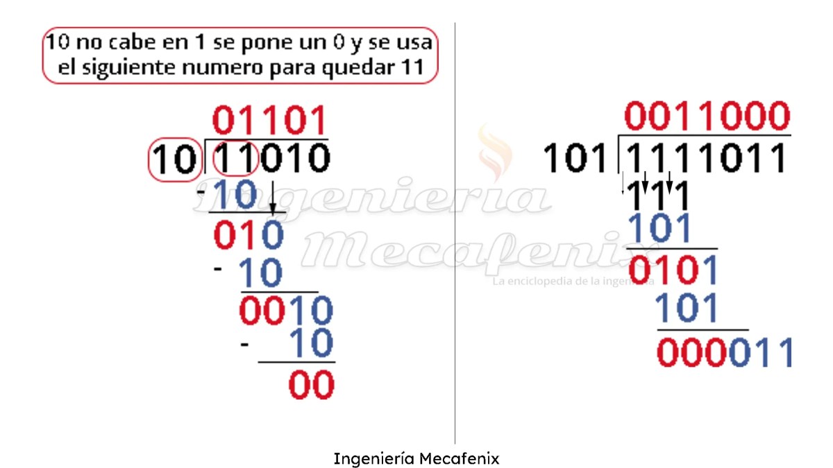 Esta operación es prácticamente igual que las divisiones con números decimales pero con una gran ventaja que en este sistema solo se utilizan dos números.