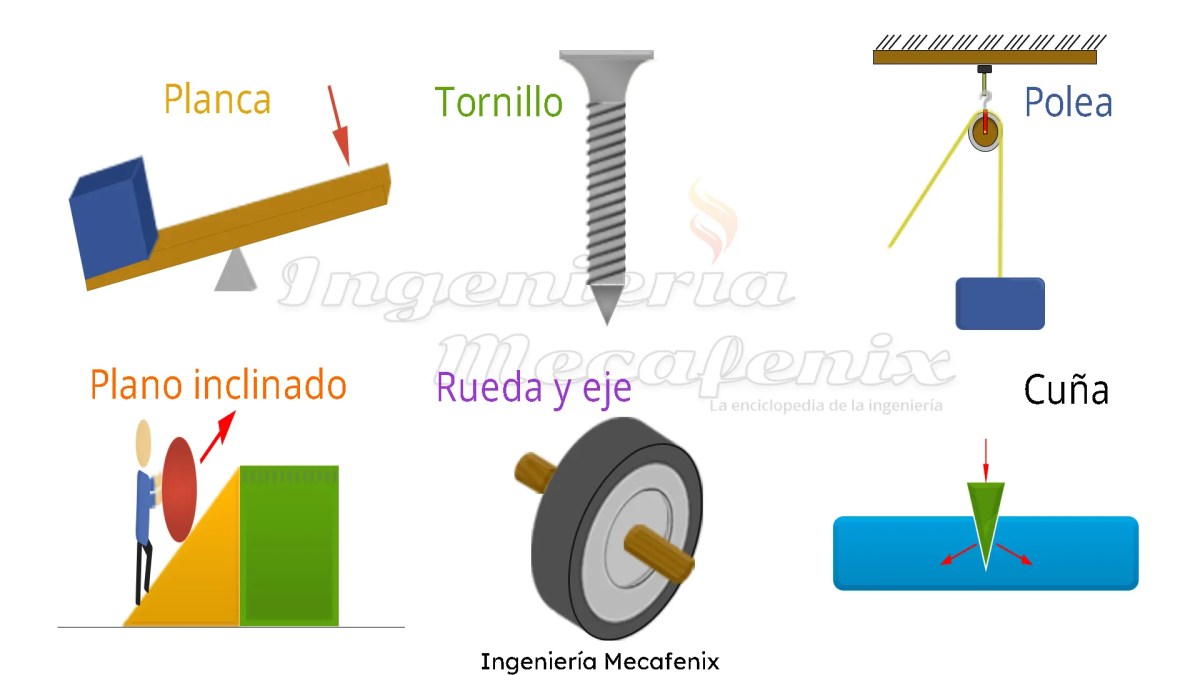 A pesar de que podemos encontrar una gran variedad de máquinas simples, podemos encontrar seis fundamentales que con algunas modificaciones ligeras o unión de dos diferentes se pueden crear unas nuevas.